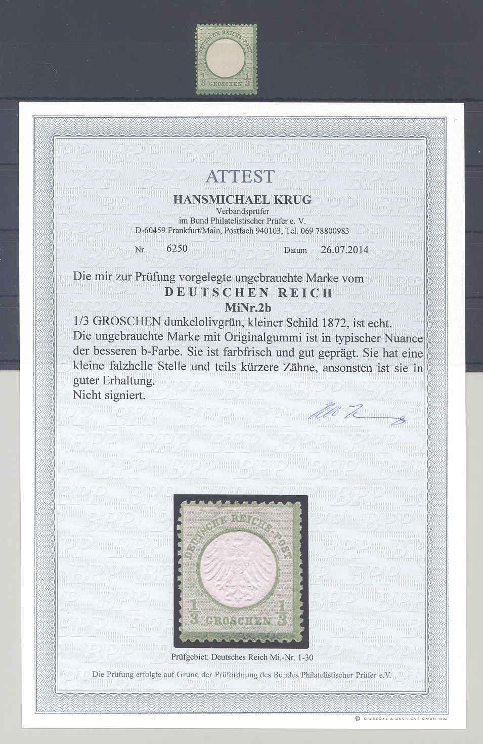 Deutsches Reich Michel Nummer 2b, 1/3 Groschen kleines Brustschild in der guten Farbe b ungebraucht * mit zwei kleineren Einschränkungen, insgesamt jedoch ein ordentlicher Wert. Es liegt ein FA BPP vor, ist mit eingescannt, hat bereits einiges gekostet.