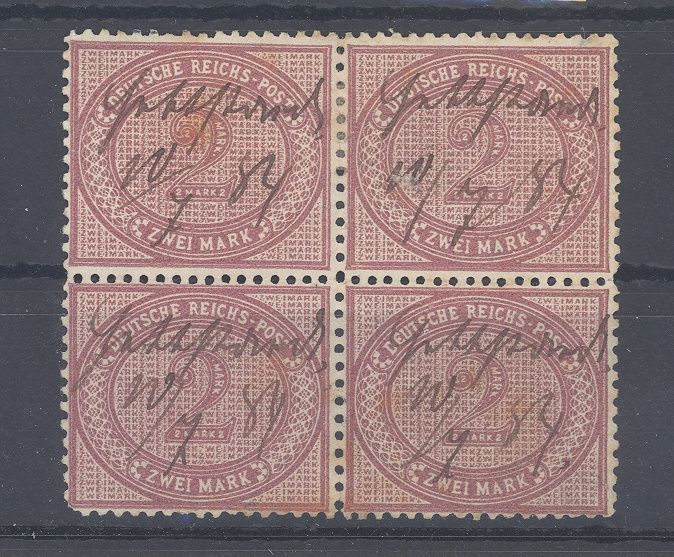Deutsches Reich Michel Nr. 37b, 2 M Freimarke im etwas stockigen gestempelten Viererblock. Die Einheit ist geprüft BPP.