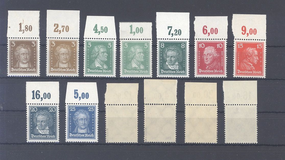 Deutsches Reich Michel Nummer 385/97, Berühmte Deutsche 1926 **, einheitlich vom Oberrand. Die wichtigen 25 - 80 Pfg. sind geprüft BPP, für die Michel Numer 393 liegt ein Befund BPP vor, ist mit eingescannt.