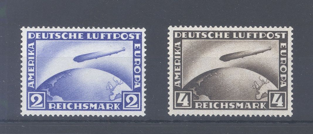Deutsches Reich Michel Nummer 423/24, Zeppelin 1928 **. Die 2 Mark Freimarke hat rückseitig einen kleineren Fleck, sonst ein ordentlicher Satz.