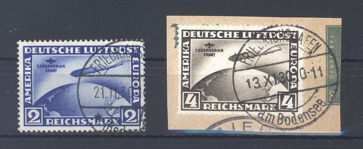 Deutsches Reich Michel Nummer 438/39x, Südamerikafahrt 1930 in der Type x gestempelt mit auch einem Briefstück. Beide Werte sind geprüft BPP.