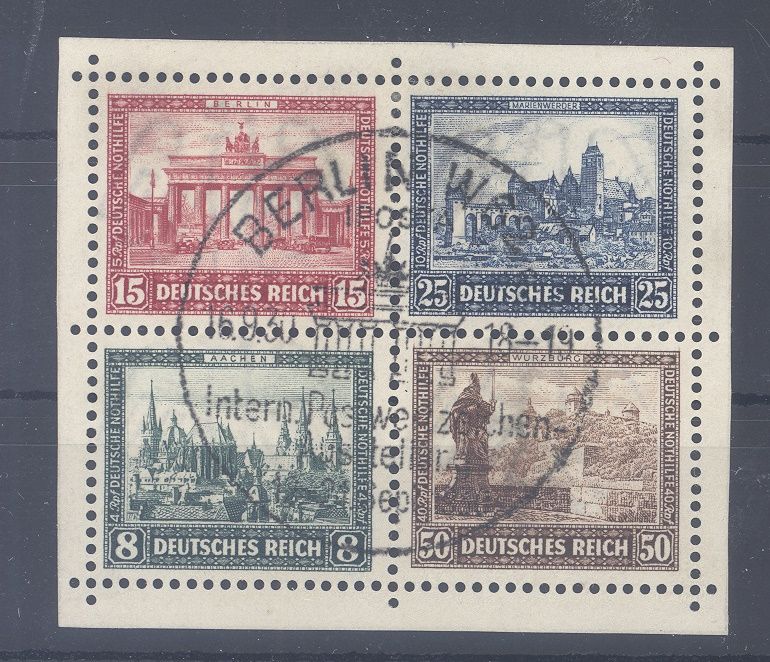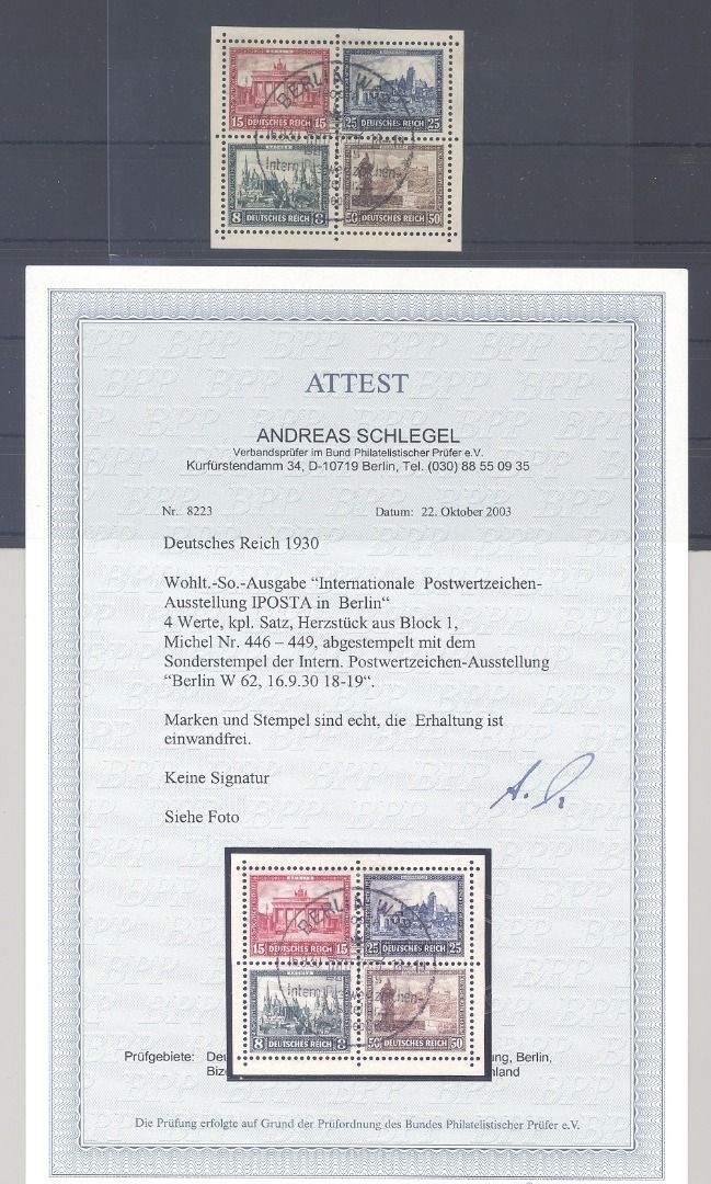 Deutsches Reich Michel Nummer 446/49, die Einzemarken aus Block 1 gestempelt mit SST, eine schöne Einheit. Es liegt ein FA BBP vor, hat bereits einiges gekostet, ist mit eingescannt.