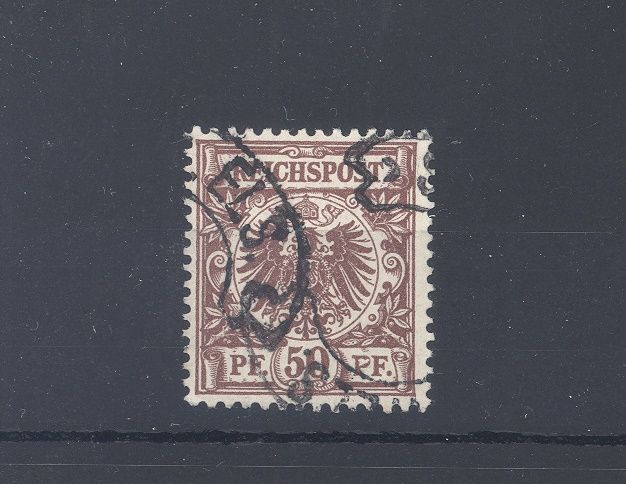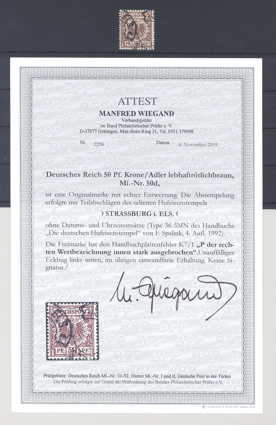 Deutsches Reich Michel Nummer 50d, die 50 Pfg. Freimarke 1889 mit Plattenfehler und seltenem Hufeisenstempel gestempelt in sehr ordentlicher Bedarfserhaltung. Es liegt ein FA BBP, hat bereits einiges gekostet, ist mit eingescannt.