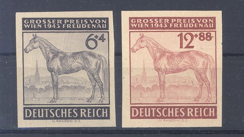 Deutsches Reich Michel Nummer 857/58, Großer Preis Wien 1943 als ungebrauchte (*) Probedrucke. Ein Wert hat einen rückseitigen Farbabklatsch und Eckbug. Nette Ergänzung zur Sammlung!