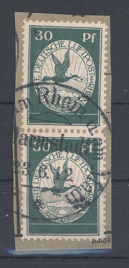 Deutsches Reich Michel Nummer III, 30 Pfg. Flugpost 1912 als gestempeltes Paar auf kleinem Briefstück.
