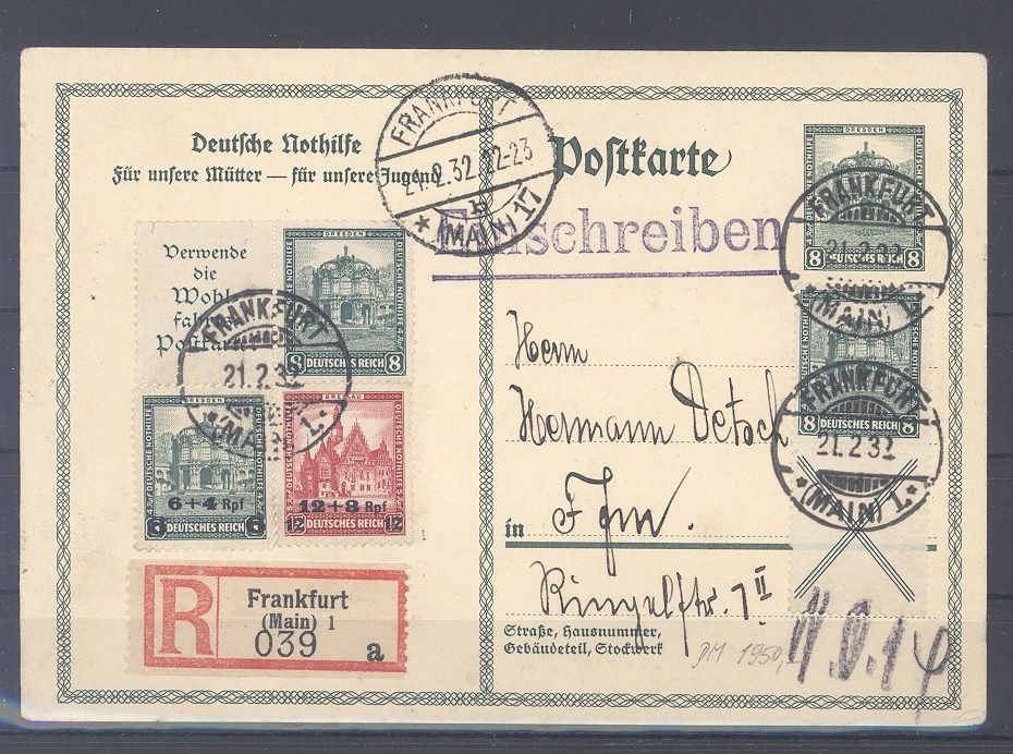 Deutsches Reich, saubere Einschreib - Karte frankiert mit u.a. zwei guten Zusammendrucken aus Nothilfe 1932. Nett!