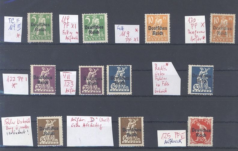 Deutsches Reich, umfangreicher interessanter Spezialposten Posten aus Michel Nummer 119/38, Freimarken 1920 auf drei Steckkarten, dabei auch Michel Nummer 126 PF I gestempelt, geprüft, wertet bereits mit 180,00 Euro. Spannende Ergänzung zur Sammlung.
