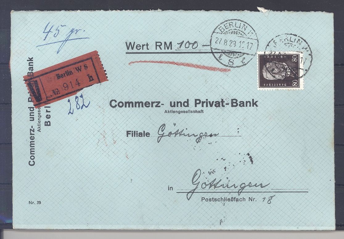 Deutsches Reich, sauberer Wertbrief portogerecht frankiert mit Michel Nummer 422, 80 Pfg. Hindenburg als EF aus Berlin nach Göttingen mit rückseitigem Ankunftsstempel gelaufen.