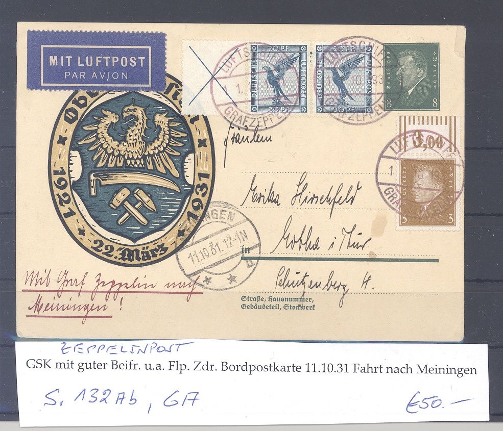 Deutsches Reich, interessante Zeppelin Karte aus dem Jahr 1931 mit kleinem Fleckchen frankiert mit Zusammendruck S 132 Ab und 3 Pfg. Ebert vom Oberrand mit tollen Stempeln. Nette Ergänzung zur Sammlung!