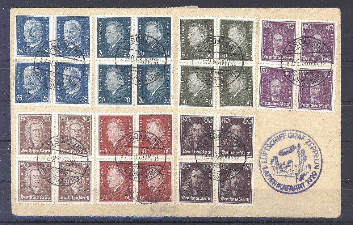 Deutsches Reich, sehr interessanter Zeppelin Brief zur 1. Amerikafahrt 1929 frankiert mit Michel Nummer 385/97, Berühmte Deutsche 1926 in Viererblöcken. Seltenheit!