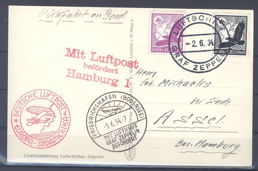 Deutsches Reich, Zeppelinkarte aus dem Jahr 1934 mit einer etwas stockigen MiF aber drei verschiedenen Stempeln. Nette Ergänzung zur Sammlung!
