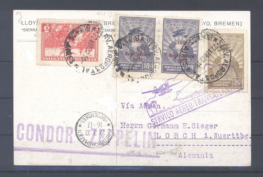 Deutsches Reich, interessante Zeppelinpost Karte aus dem Jahr 1932 aus Argentinien nach Friedrichshafen gelaufen. Nette Ergänzung zur Sammlung!