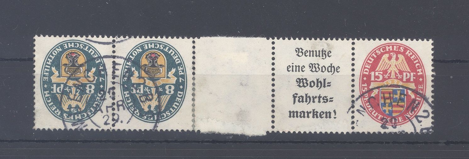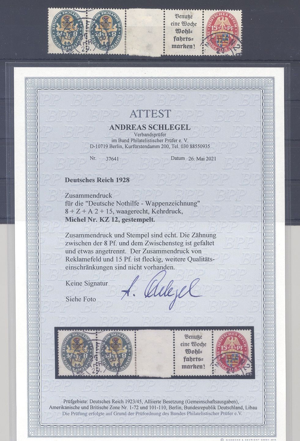 Deutsches Reich Zusammendruck Michel Nummer KZ 12, 8 + 15 Pfg. Nothilfe 1928 gestempelt, etwas fleckig, sonst ordentlich. Es liegt ein FA BPP vor, ist mit eingescannt, hat bereits einiges gekostet, große Seltenheit!