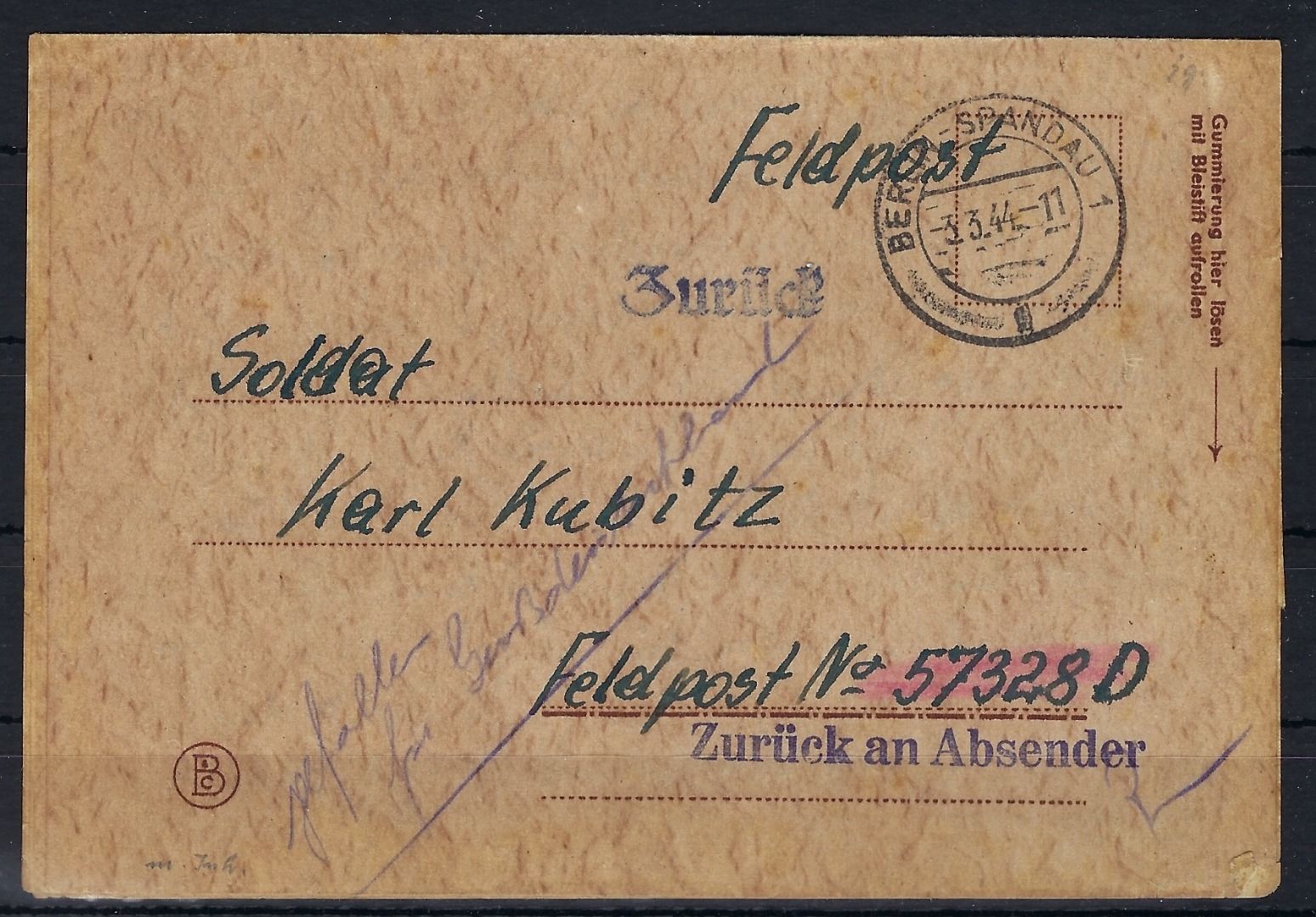 Feldpost Heimat-Front an SoldatKarl Kubitz Feldpostnummer 57325D , zurück, GEFALLEN FÜR GROßDEUTSCHLAND