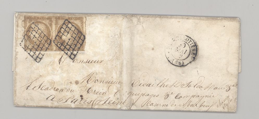 Frankreich, sehr interessanter Brief frankiert mit sogar 2 x Michel Nummer 1, 10 Cent Freimarke 1849 sogar als Paar (!) mit Mängeln als MeF aus Aareau nach Paris gelaufen. Der Michel für lose gestempelte Einzelmarken beträgt bereits 800,00 Euro, Seltenheit!