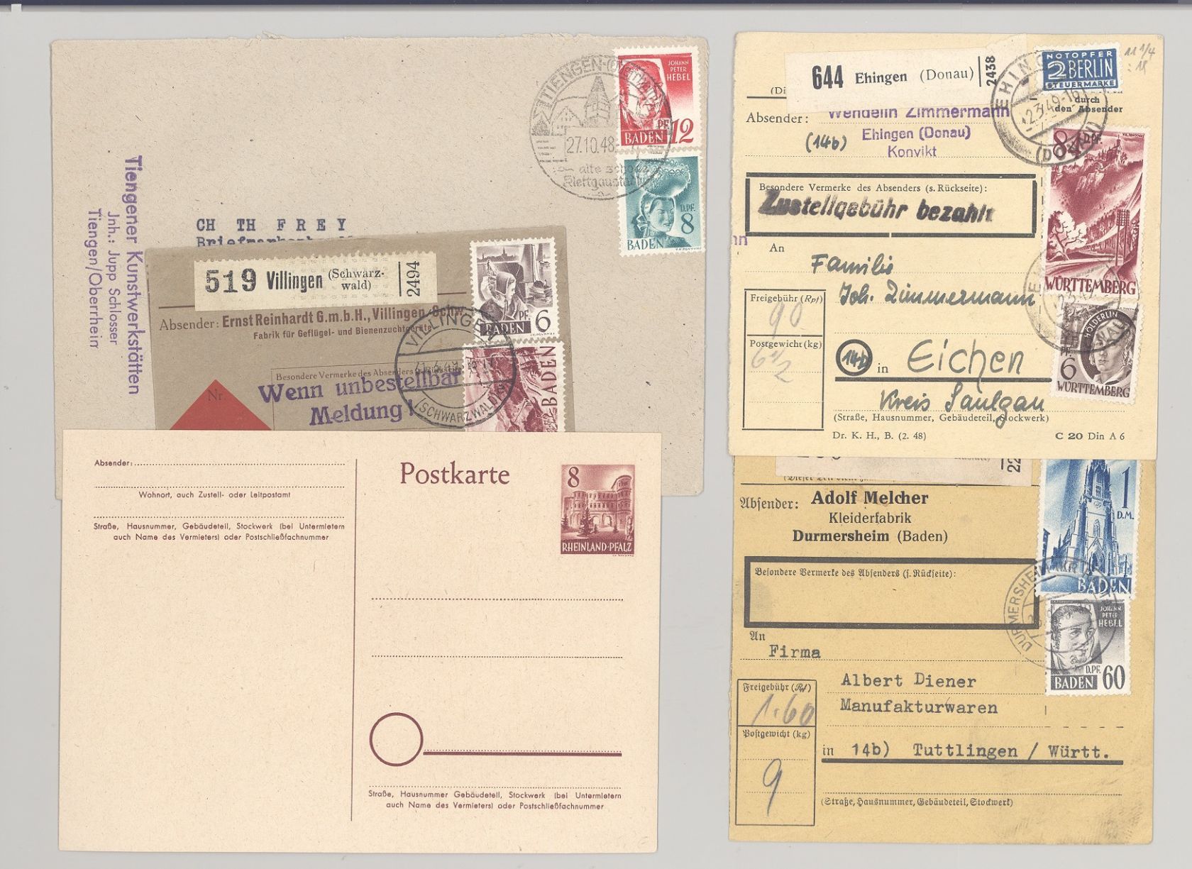 Französische Zone, fünf verschiedene Belege mit auch drei Paketkarten als Posten. Nette Ergänzung zur Sammlung!