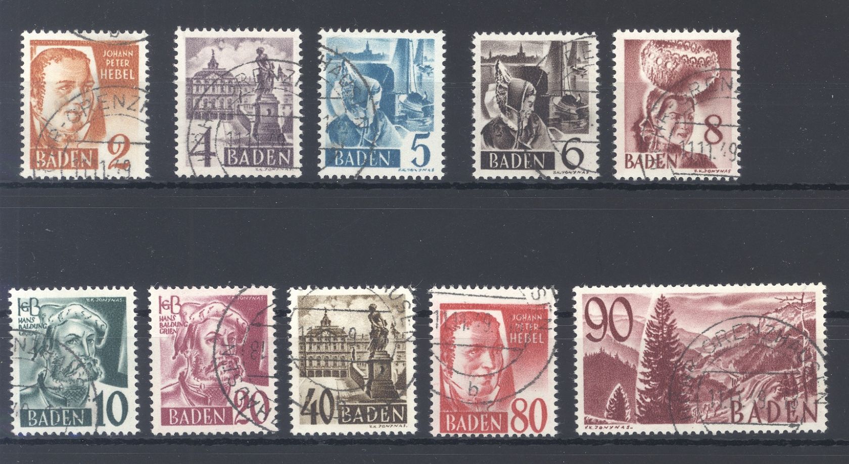 Französische Zone Baden Michel Nummer 28/37, Freimarken III gestempelt.