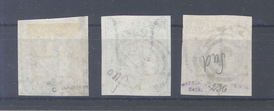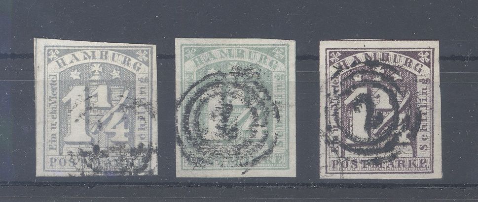 Hamburg, 3 x Michel Nummer 8, 1 1/4. S. Freimarke 1864 gestempelt in wohl verschiedenen Farben, die Michel Nummer 8c ist geprüft. Die billigsten Farben werten bereits mit 300,00 Euro.