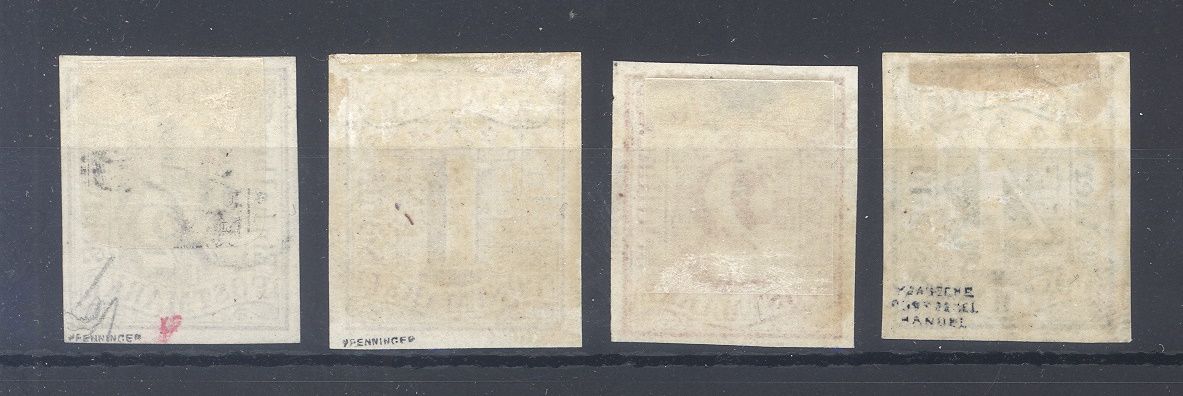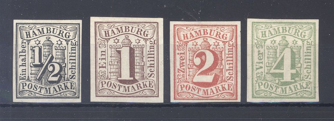 Hamburg, vier ungebrauchte * Werte aus Michel Nummer 1/7, Freimarken 1859 bestehend aus Michel Nummer 1, 2, 3 und 5. Bis auf einen Wert ist jeder Wert geprüft mit Altprüfung, nett!