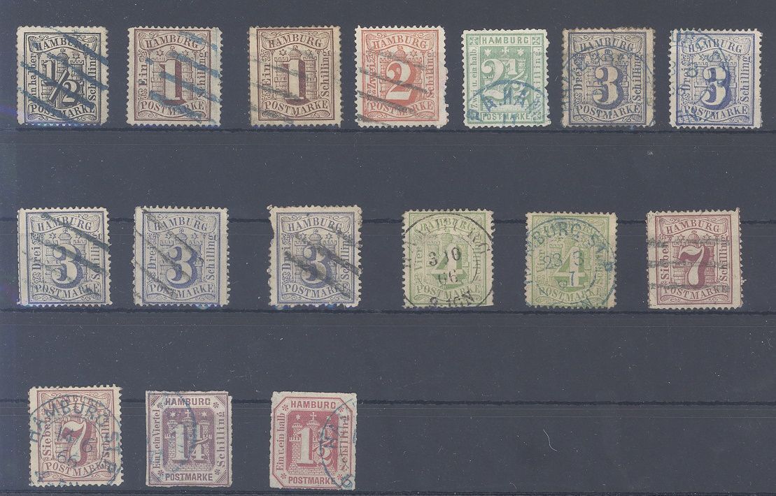 Hamburg, gestempelter Posten auf Steckkarte, dabei auch die Michel Nummern 20/21. Die billigsten Typen werten bereits mit
