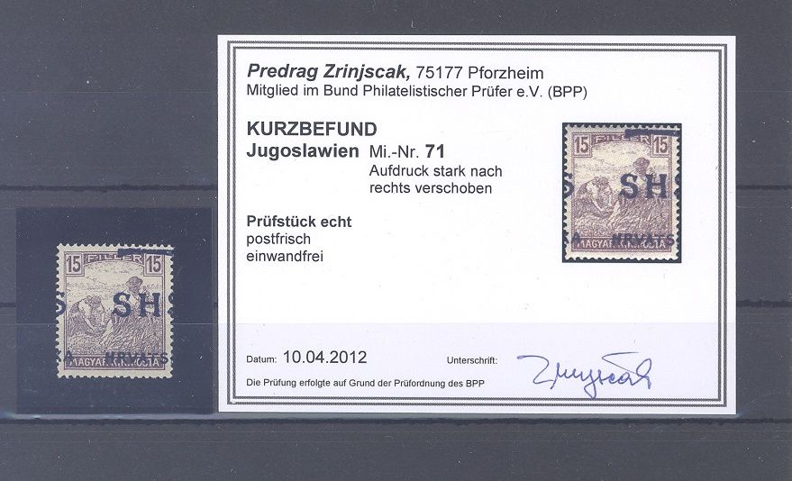 Jugoslawien Michel Nummer 71, 15 Filler mit verschobenem Aufdruck **. Es liegt ein Befund vor, hat bereits einiges gekostet, ist mit eingescannt.