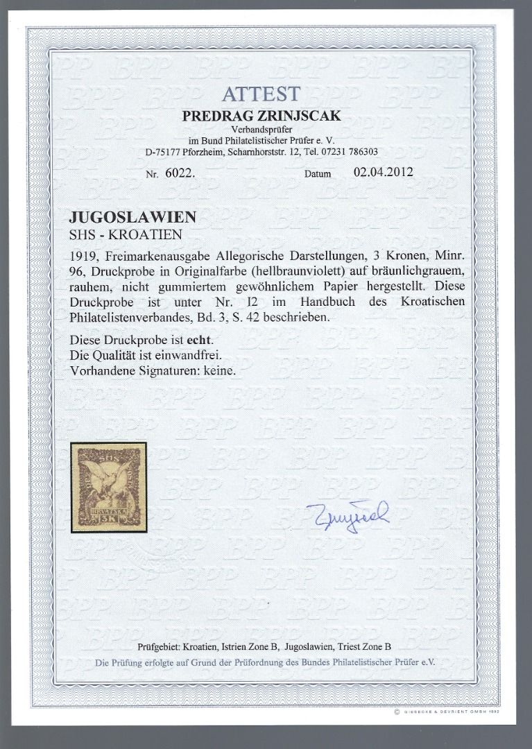 Jugoslawien / SHS-Kroatien 1919, Mi 96 U (*) Probe, FA Zrinjscak