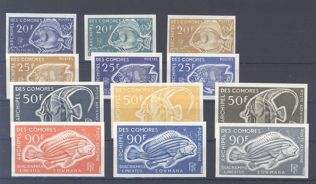 Komoren, Michel Nummer 88-91 PU, einheimische Fische jeder Wert in drei verschiedenen Farbprobedrucken als ungezähnte Probedrucke **. Hatte mal 150,00 Euro gekostet...