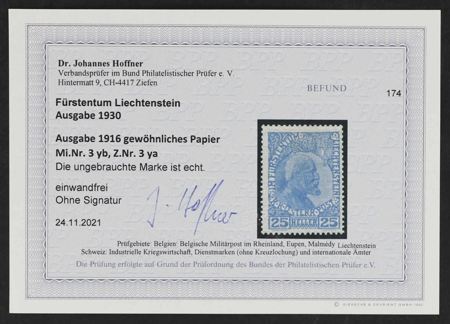 Liechtenstein Mi 3 y b ungebraucht mit Originalgummierung, einwandfrei mit Befund Hoffner BPP