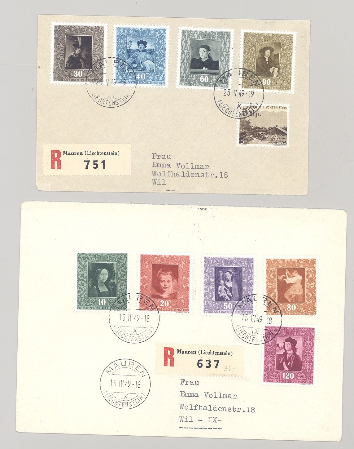 Liechtenstein Michel Nummer 268-276, Gemälde 1949, auf zwei gelaufenen FDC. Nette Ergänzung zur Sammlung!