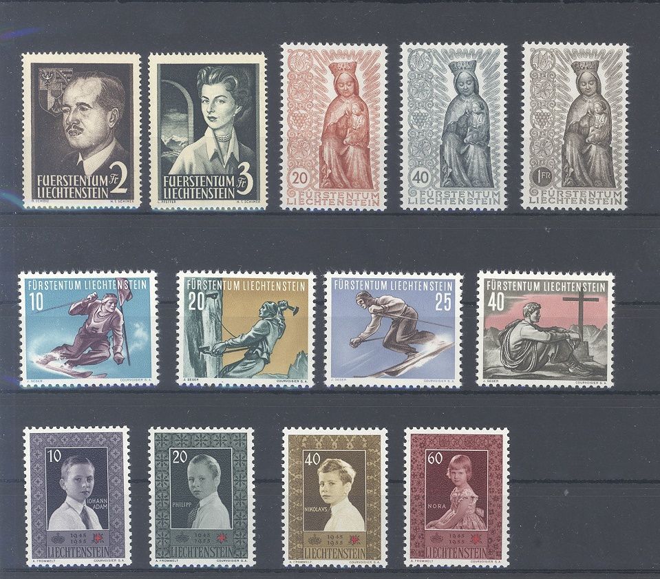 Liechtenstein Michel Nummer 332/341, das Jahr 1955 ** auf Steckkarte.