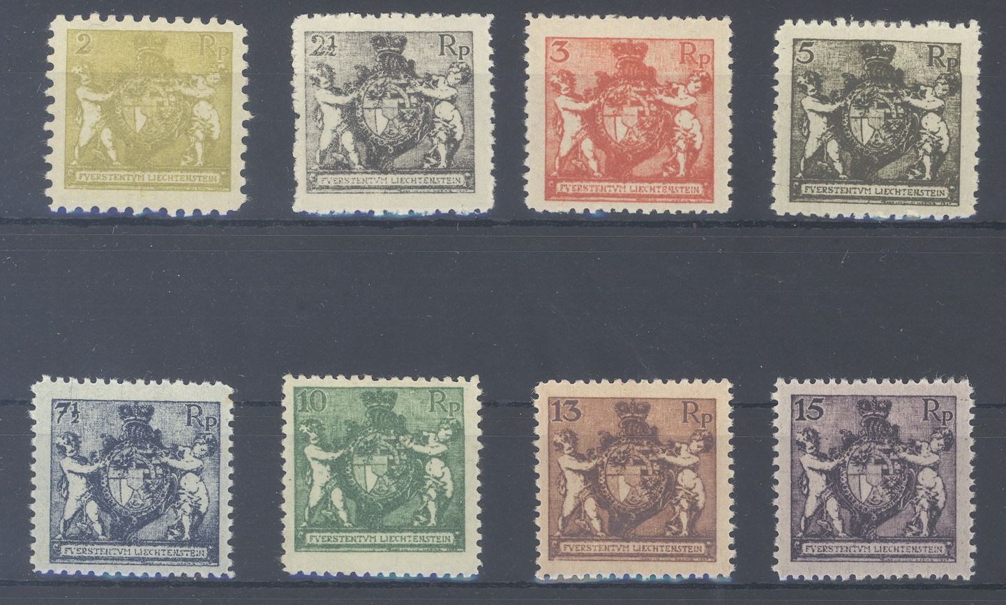 Liechtenstein, Michel Nummer 45/52 B, Freimarken 1921 ungebraucht *, diese werten für ** mit 440,00 Euro. Dazu auch noch unberechnet die Michel Nummer 45 A.