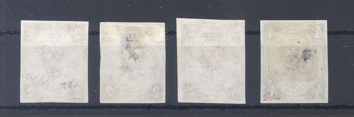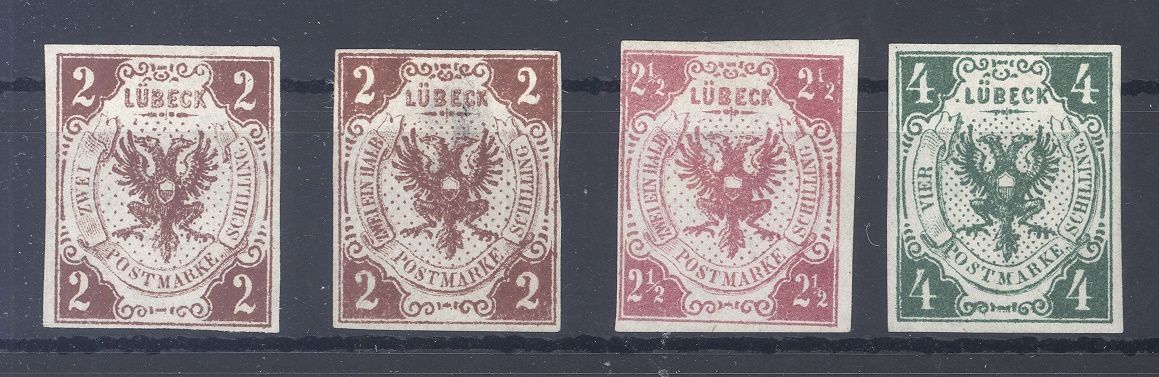 Lübeck, vier verschiedene ungebrauchte Werte als Posten. Es sind die Michel Nummern 3, 3 F, 4 und 5 vorhanden. Die Michel Nummer 3 F hat eine helle Stelle oben, sonst ordentlich