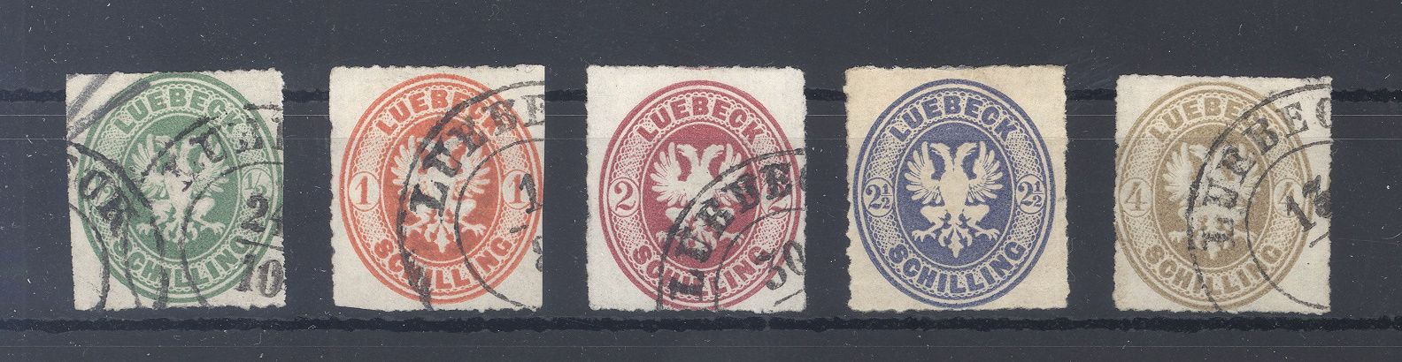 Lübeck Michel Nummer 8/12 Freimarken 1863/65 */gestempelt, die Michel Nummer 11 ist ungebraucht *. die anderen Werte sind gestempelt.