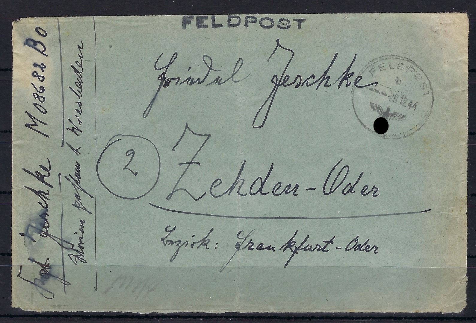 Feldpostbrief ohne Inhalt aus St. Nazaire vom 20.12.1944, Front - Heimat. Feldpostnummer M08682 = Hafenkommandant Saint Nazaire, rückseitig mit Zensurstreifen und Stempel der Zensurstelle "e". Der beleg stammt aus der bekannten Jeschke Korrespondenz