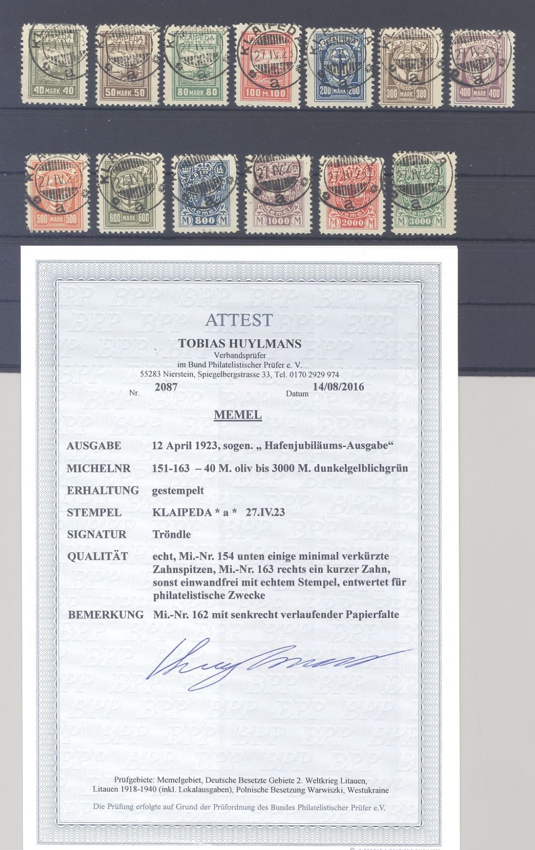 Memel Litauische Besetzung Michel Nummer 151/63, Freimarken 1923 gestempelt in etwas unterschiedlicher, insgesamt aber doch ordentlicher Erhaltung. Es liegt ein FA BPP vor, ist mit eingescannt, hat bereits einiges gekostet.