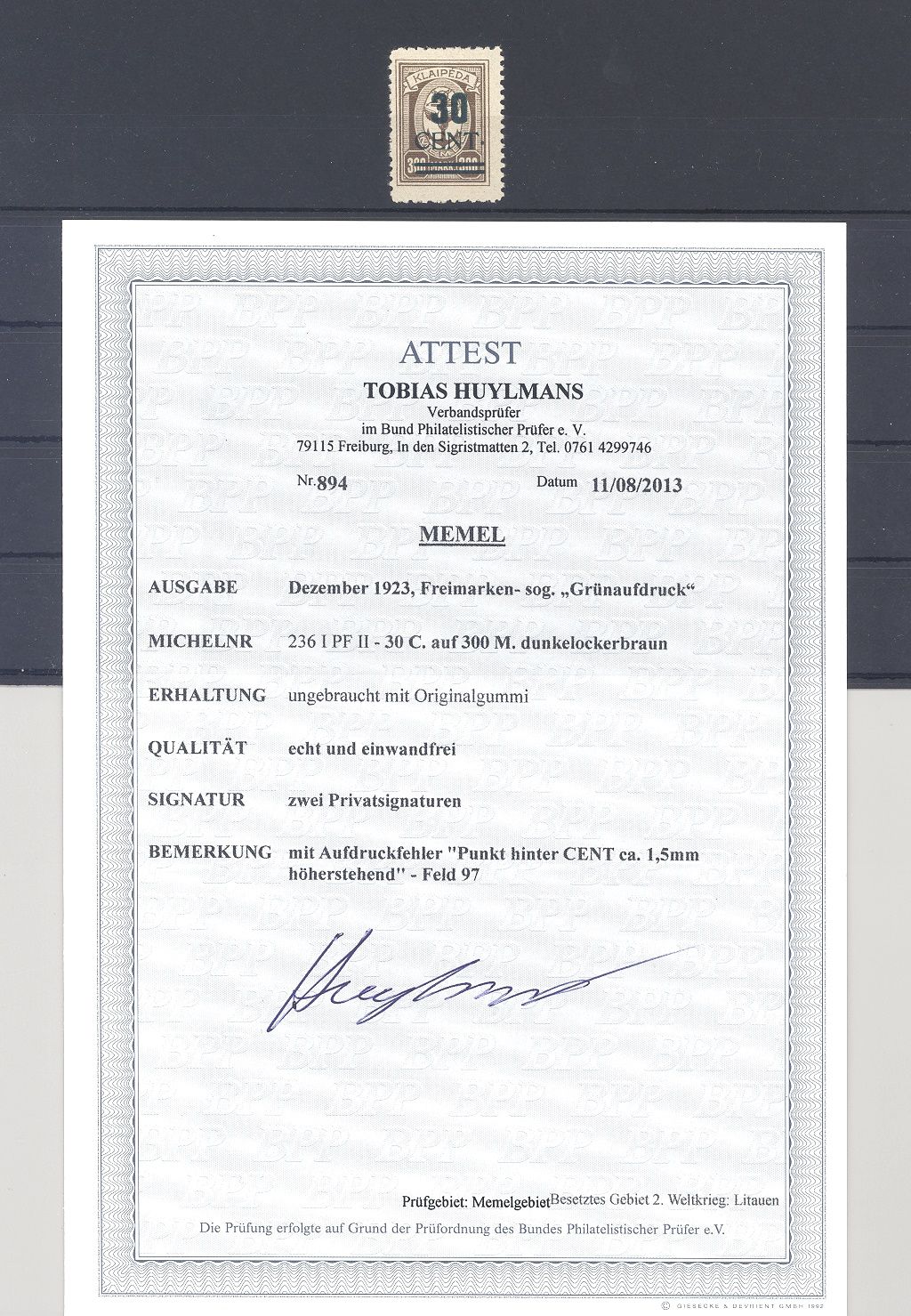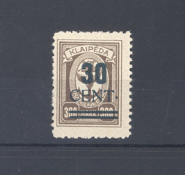 Memel Michel Nummer 236 I PF II, die 30 C. Litauische Besetzung Dezember Ausgabe mit dem markanten Plattenfehler II, Punkt hinter Cent höherstehend, ungebraucht *. Ein sehr schöner Wert. Es liegt ein FA BPP vor, ist mit eingescannt, hat bereits einiges gekostet.