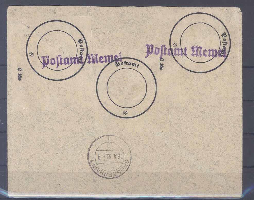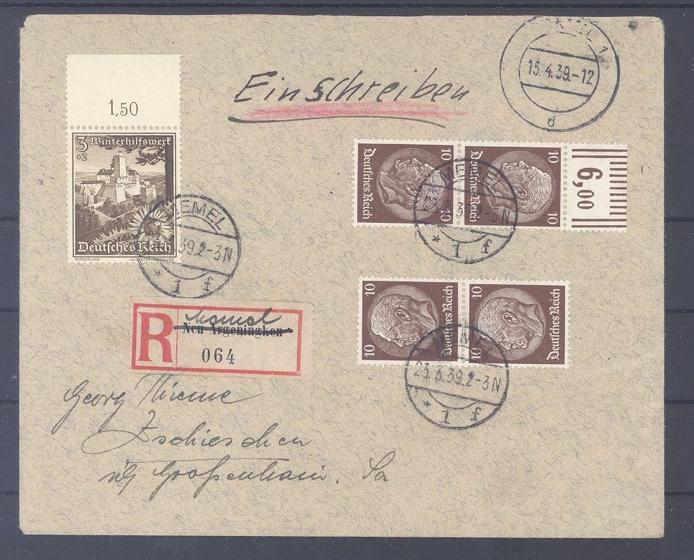 Memel, sehr interessanter Einschreib - Brief vom 15.4.1939 aus Neu Argeningken mit rückseitigen Verschlusszetteln vom Postamt Memel nach Grossenhain mit rückseitigem Ankunftsstempel gelaufen. Tolle Ergänzung zur Sammlung!