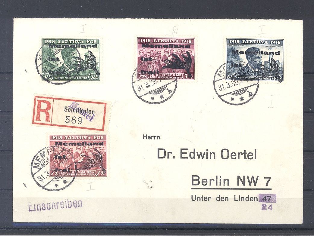 Memel, sehr interessanter Einschreib - Brief frankiert mit Lokalausgabe Michel Nummer I-IV aus Memel mit überdrucktem R - Zettel Schillkojen nach Berlin mit rückseitigem Ankunftsstempel gelaufen. Dabei auch einmal die bessere Type III, tolle Ergänzung zur Sammlung!