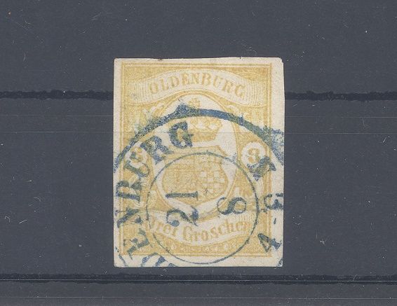Oldenburg Michel Nummer 14, 3 Groschen Freimarke 1861 gestempelt. Der Wert ist geprüft mit Altprüfung Bühler.