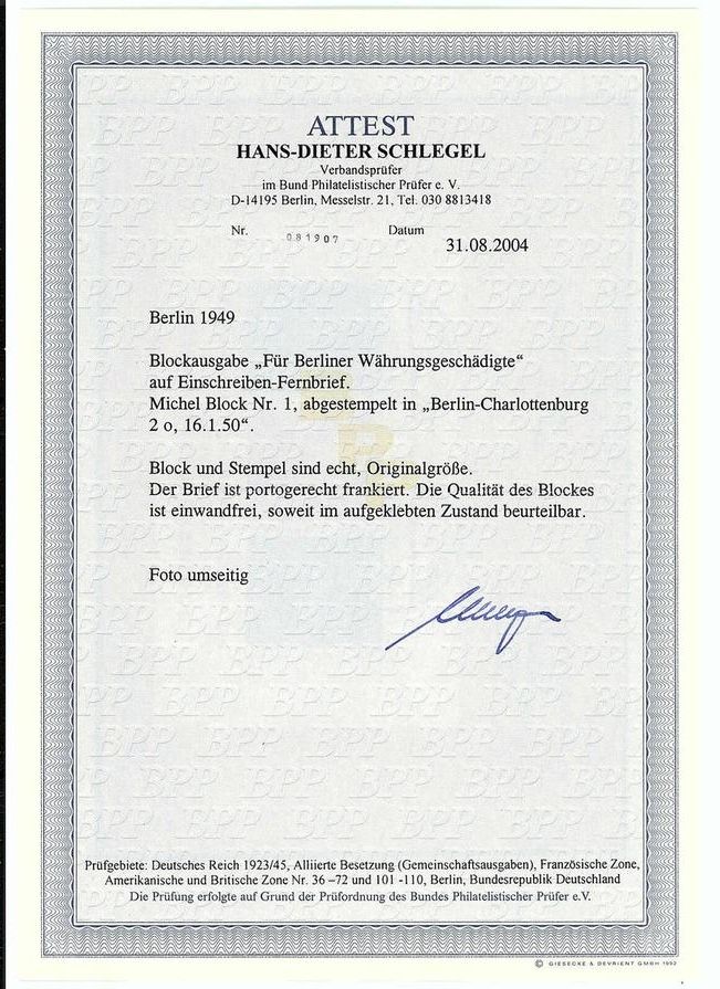 Währungsgeschädigten-Block 1949 Nr. 1, sauber und portogerecht auf Einschreiben-Fernbrief, entwertet ,,BERLIN-CHARLOTTENBURG 2 o, 16.1.50". Fotoattest Schlegel BPP "Die Qualität des Blockes ist einwandfrei, soweit im aufgeklebten Zustand beurteilbar", ME 4.000,-€