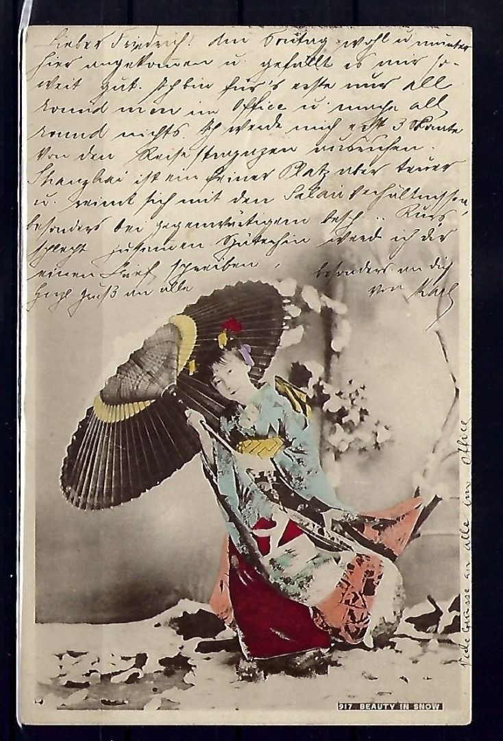 AK Schönheit im Schnee, mit sauberem Stempel „Shanghai Typ 4“, befördert nach England, mit sauberem Ankunftsstempel „London 1902“ — seltene Destination!