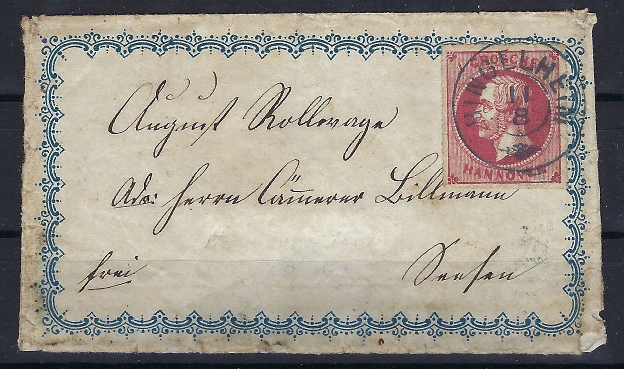 Hannover 1864, seltener Zierbrief ab Ringelheim mit sauberem K2 „Ringelheim 11.8.“ in Blau. Rückseitig fehlt die untere Verschlussklappe, Format 10 × 5,8 cm. Solche hannoverschen Zierbriefe sind sehr selten.