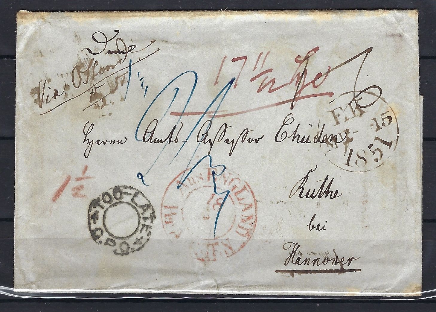 Eingehende Überseebrief aus Uruguay via Ostende n. Ruthe bei Hannover, mit rotem K2 aus England via Aachen sowie schwarzer K2 Tor Late C.P.O., ohne Inhalt