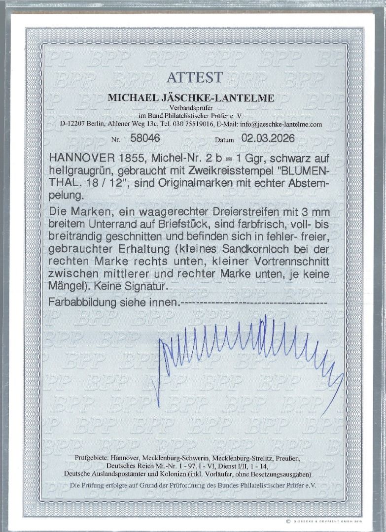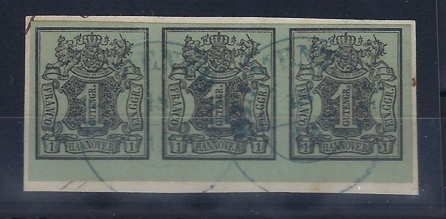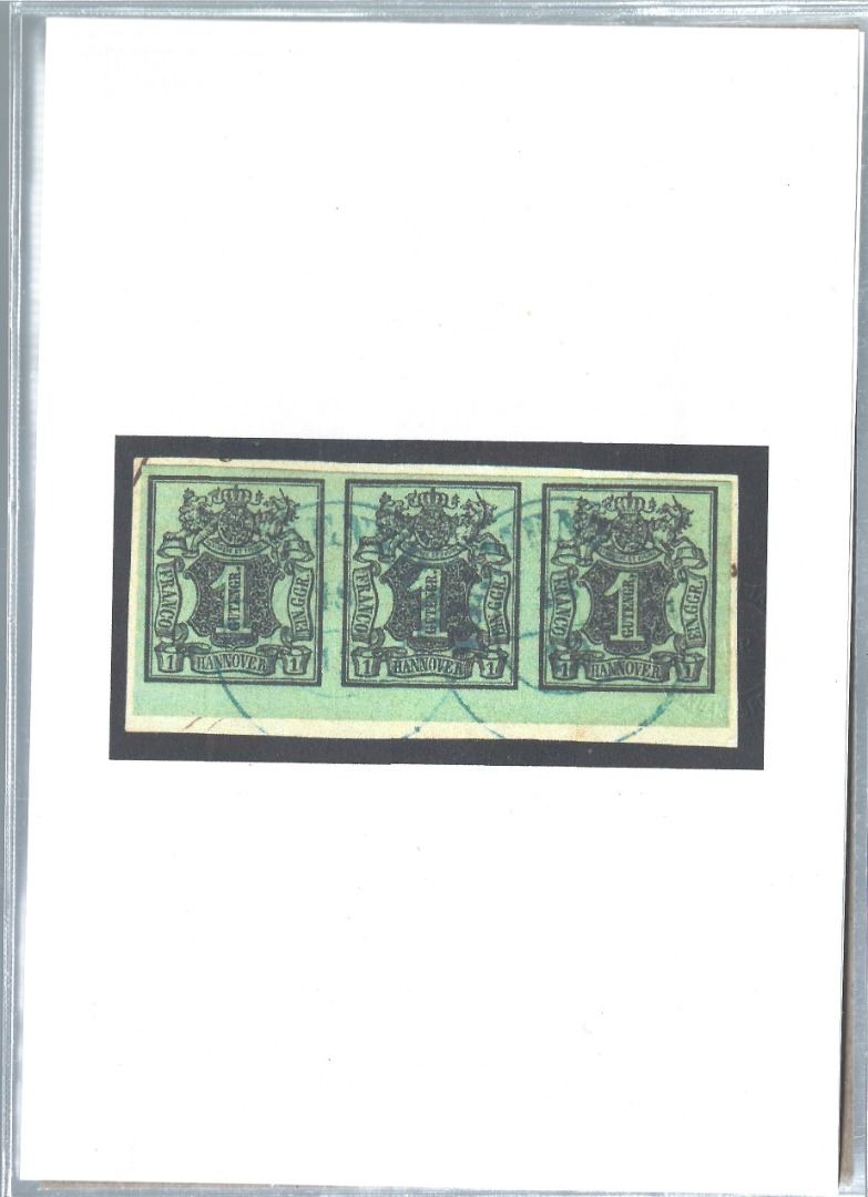 Hannover Mi 2b im waagerechten Dreierstreifen vom Unterrand auf Briefstück, voll- bis breitrandig, mit FFA Jäschke-Lantelme BPP
