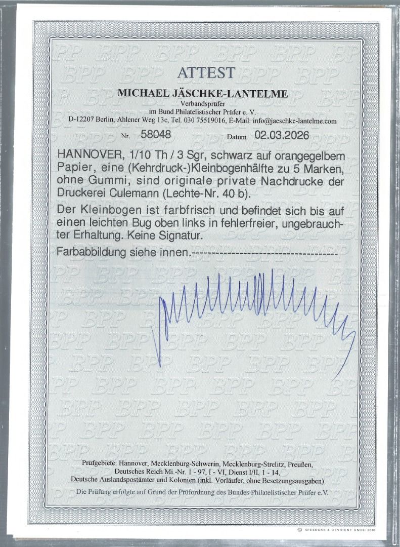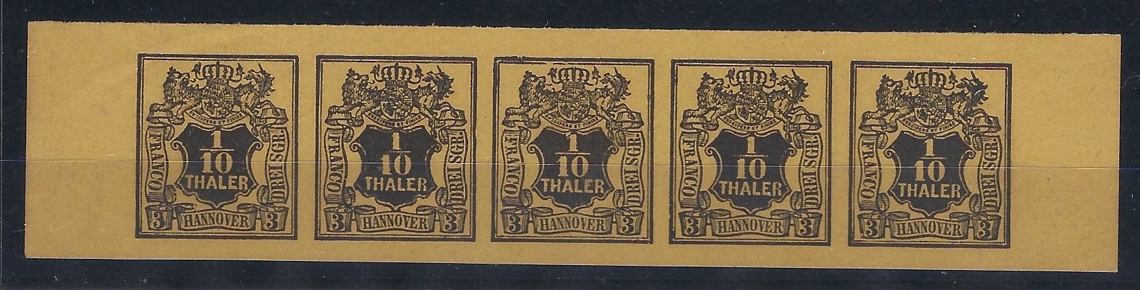 Hannover, Lechte-Nr. 40 b (*) ungebraucht ohne Gummi, 5er Streifen aus Kerndruck-Bogenhälte, Privatdruck der Königlichen Hannoverschen Buchdruckerei Culemann. Mit FFA Jäschke-Lantelme BPP. Seltene Gelegenheit, ein Stück hannoverscher Geschichte zu erwerben