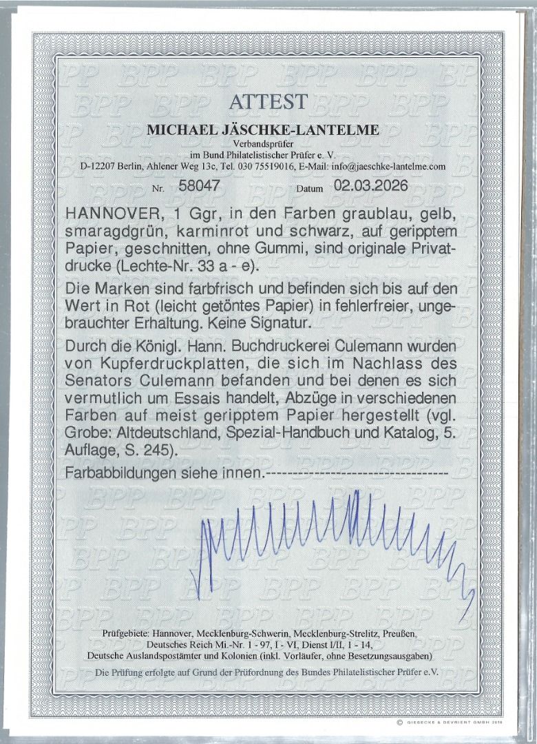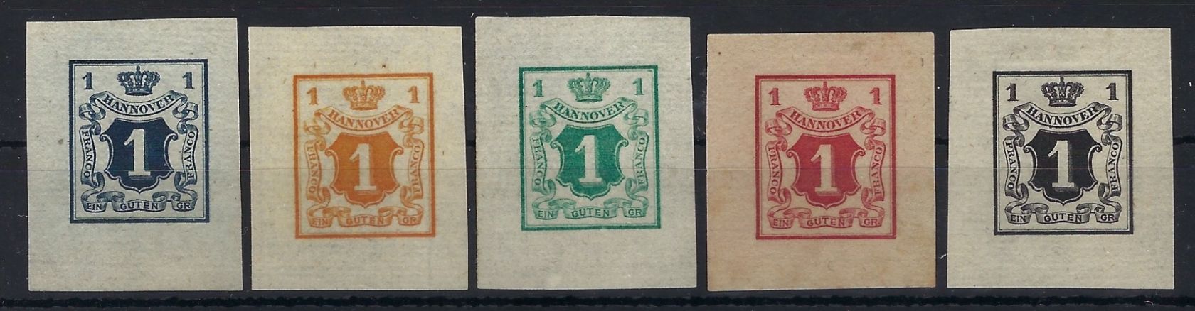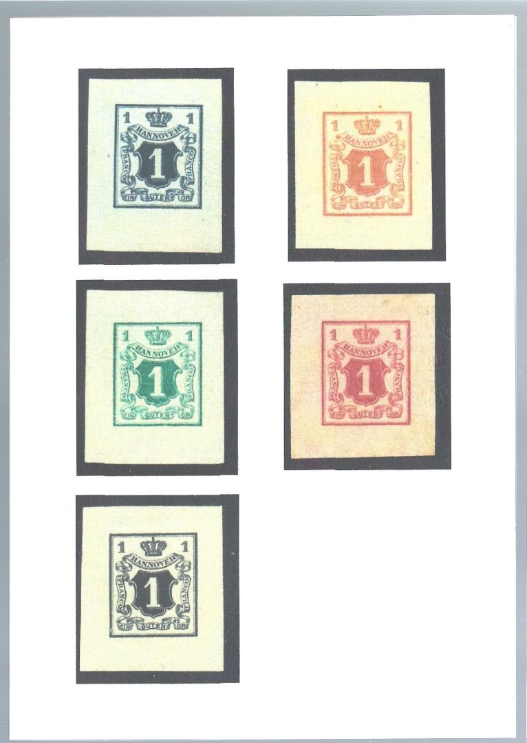 Hannover, komplette Serie der Privatdrucke Lechte-Nr. 33 a–e in fünf verschiedenen Farben. Die Probedrucke in der damalige Königlichen Hannoverschen Buchdruckerei Culemann. Mit Farbfotoattest Jäschke-Lantelme BPP. Eine einmalige Gelegenheit, ein Stück hannoverscher Geschichte zu erwerben.