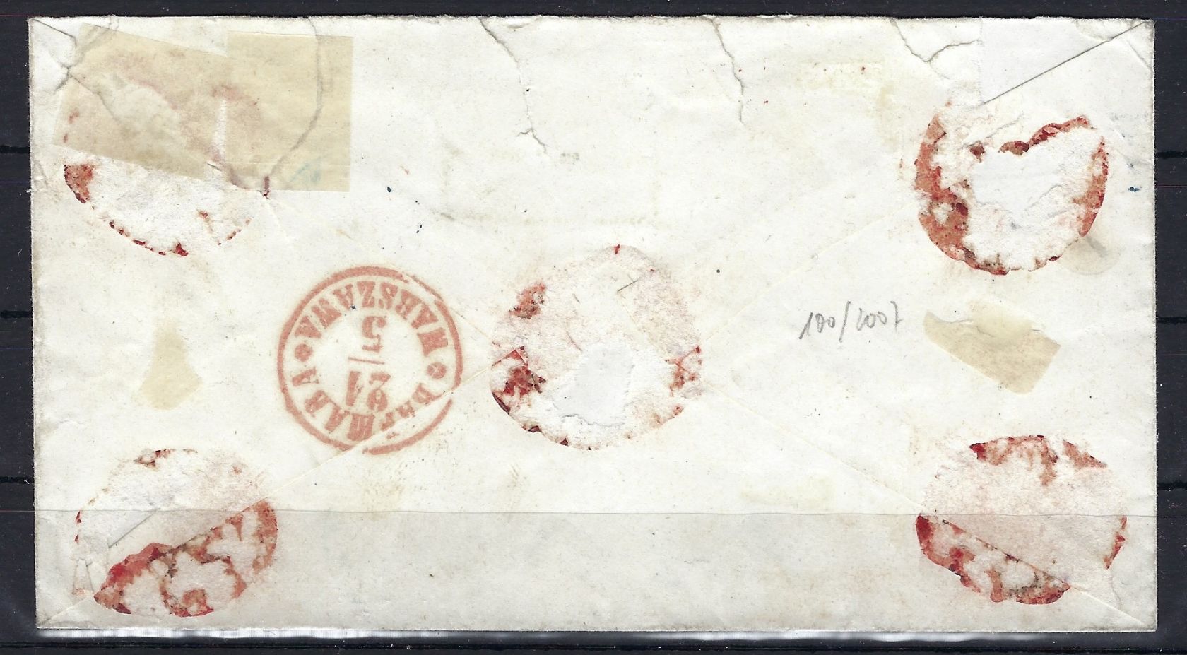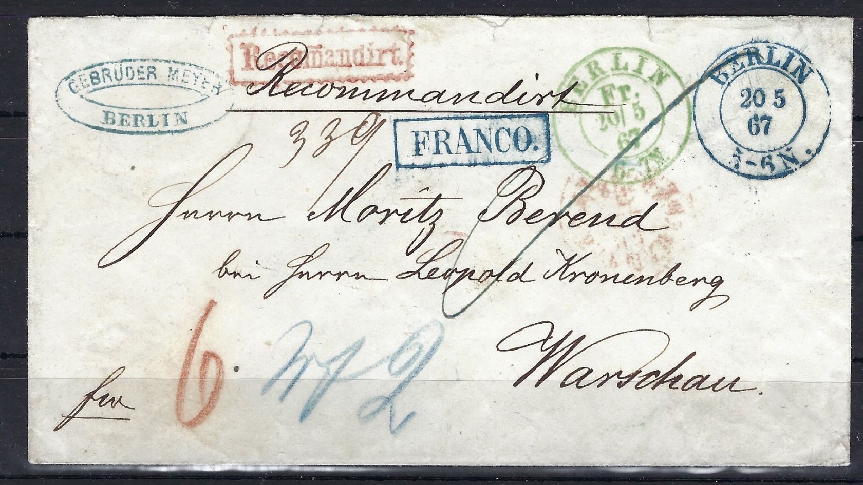 Preußen 1866–1867, Einschreibebrief mit K2 „Berlin“ in Blau und Grün, befördert nach Warschau (Russland). Vom Annahmebeamten bearbeitet und mit blauem K2 „Berlin“ gestempelt, anschließend vom Abnahmebeamten vorschriftsgemäß mit grünem K2 „Berlin“ gestempelt, zusätzlich Ra1 „Franco“. Nicht häufiger Beleg in sehr guter Qualität.