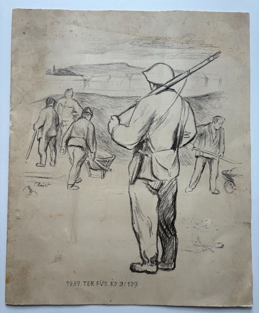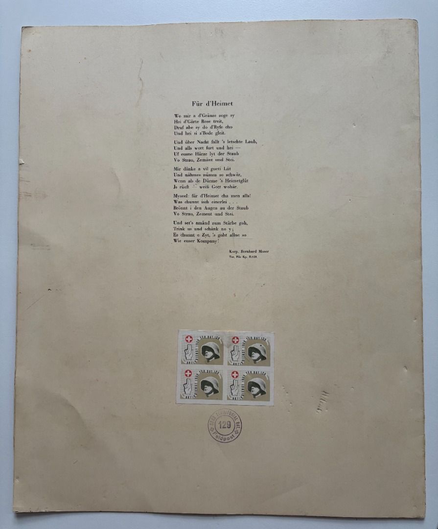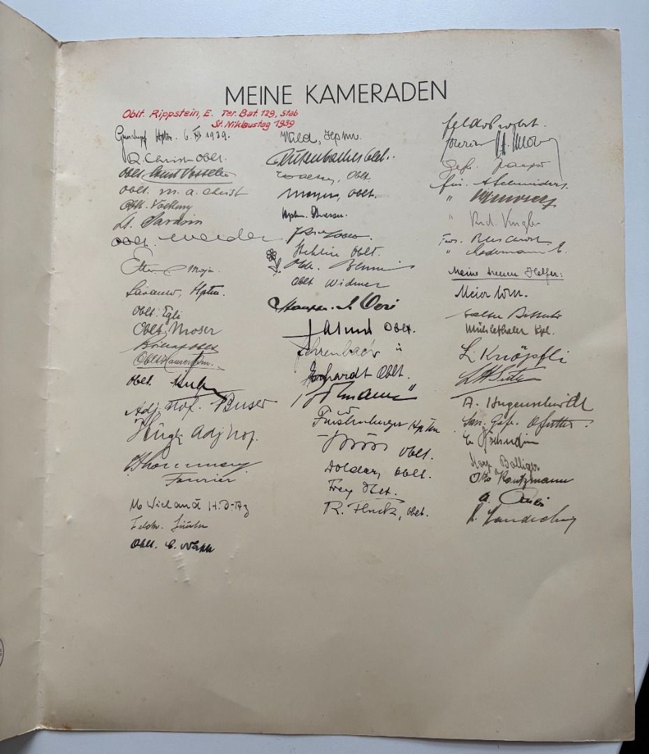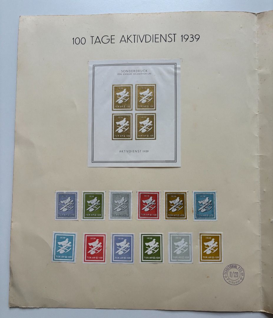 Mappe "100 Tage Aktivdienst 1939" Territorial Füsilier KP II/129. Titelmotiv von Christ, eingeklebter Briefmarkenblock Soldatenhilfe "Aktivdienst 1939" und 12 Einzelmarken, 61 Unterschriften der Kameraden für Stabsmitglied Oberleutnant E. Rippstein am Nikolaustag 1939