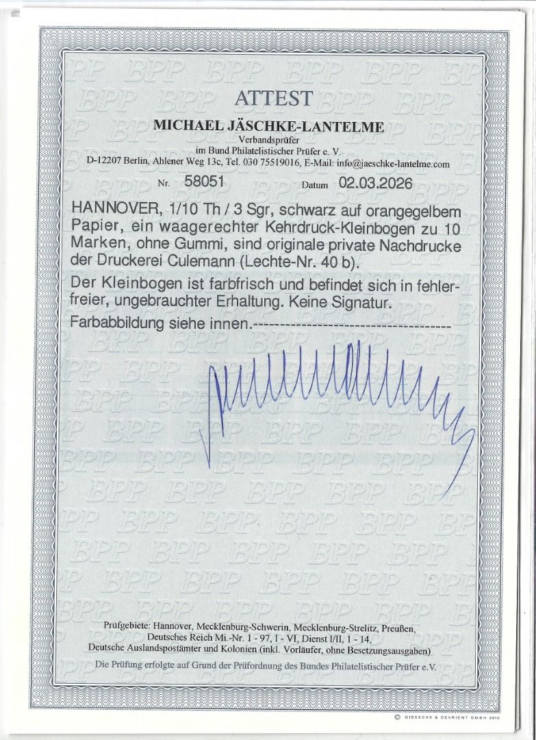 Hannover, Lechte-Nr. 40 b (*) ungebraucht ohne Gummi, Kerndruck-Kleinbogen, Privatdruck der Königlichen Hannoverschen Buchdruckerei Culemann. Mit FFA Jäschke-Lantelme BPP. Seltene Gelegenheit, ein Stück hannoverscher Geschichte zu erwerben