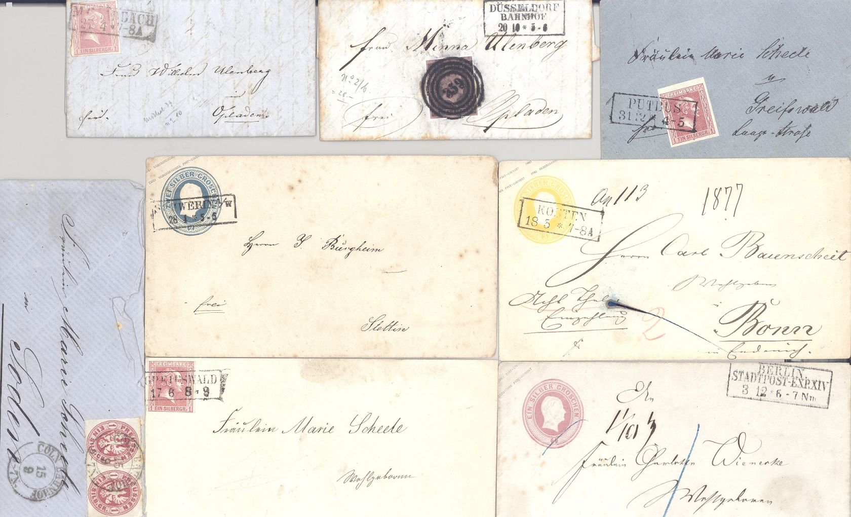 Preußen, acht verschiedene Belege in wie üblich unterschiedlicher Erhaltung als Posten, einfach zusammengesteckt mit auch einem Bahnpost Brief. Vollkommen unberechnet, sollte ein nettes Schnäppchen sein...